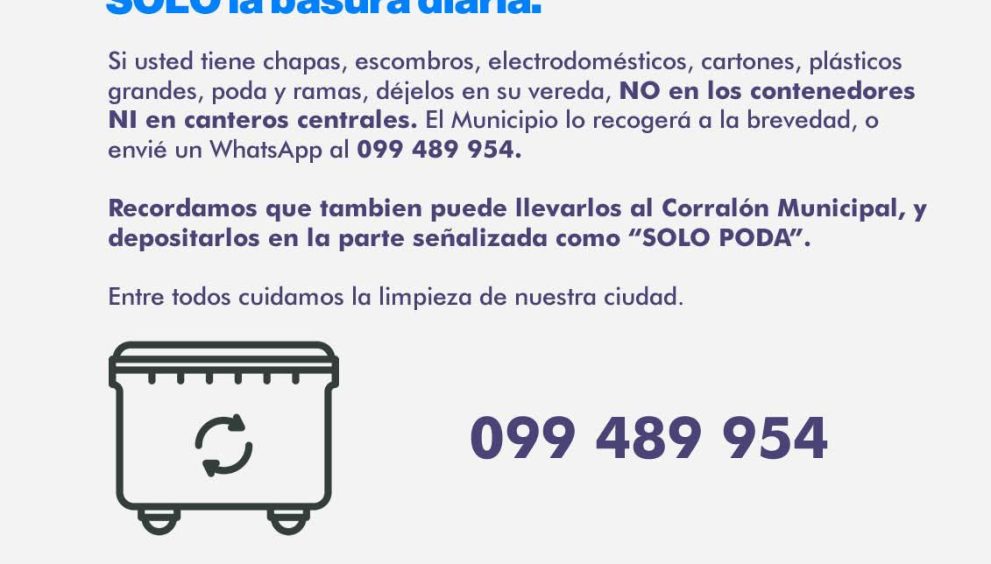 Si usted tiene chapas, escombros, electrodomésticos, cartones, plásticos grandes, poda y ramas, déjelos en su vereda, NO en los contenedores NI en canteros centrales. El Municipio lo recogerá a la brevedad, o envié un WhatsApp al 099489954.