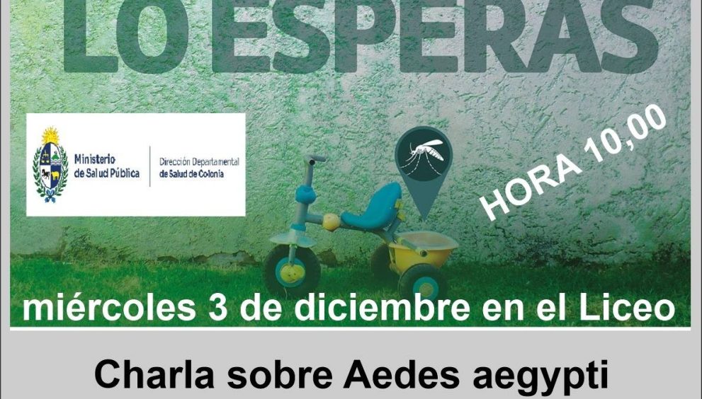 La Agencia de Desarrollo de Tarariras (ADE) invita a Instituciones y publico en general a una charla informativa sobre Aedes aegypti. Tiene como objetivo brindar información actualizada sobre medidas de prevención, características del mosquito transmisor y acciones comunitarias para evitar su propagación. Tema de mucha importancia en la época del año en que nos encontramos y de gran relevancia para la población de nuestra ciudad, la charla será el próximo miércoles 3 de diciembre hora 10 en el liceo de TARARIRAS.