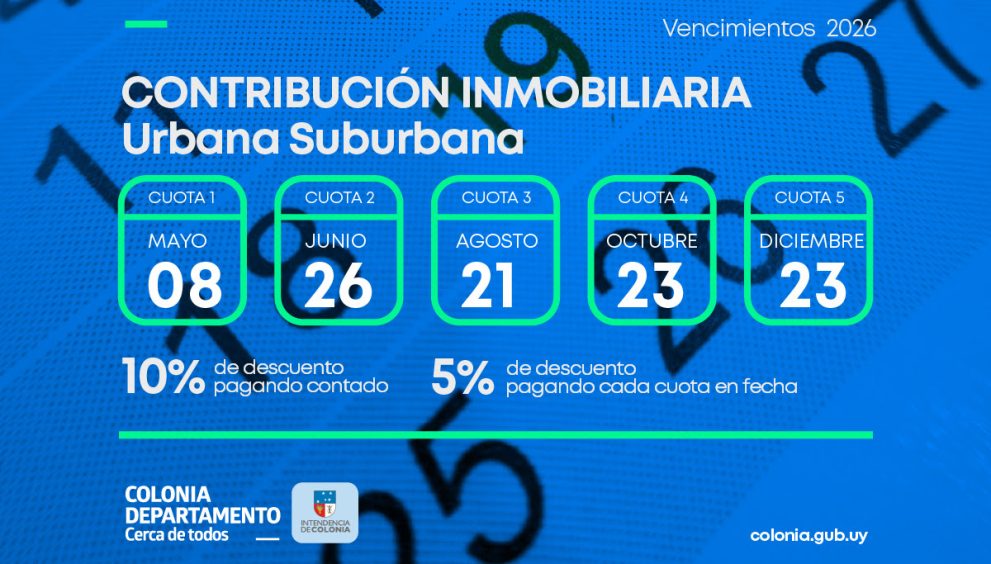La Intendencia de Colonia a través del Departamento de Hacienda y Administración, informa el calendario de pago del Impuesto de Contribución Inmobiliaria Urbana y Sub Urbana, Ejercicio 2026.