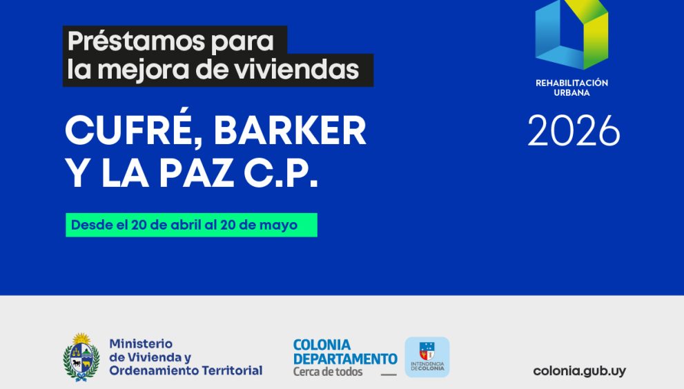 La Intendencia de Colonia a través de la Dirección de Vivienda, informa que se encuentran abiertas las inscripciones para acceder a los préstamos para la Mejora de Viviendas, en las localidades de Cufré, Barker y La Paz C.P.