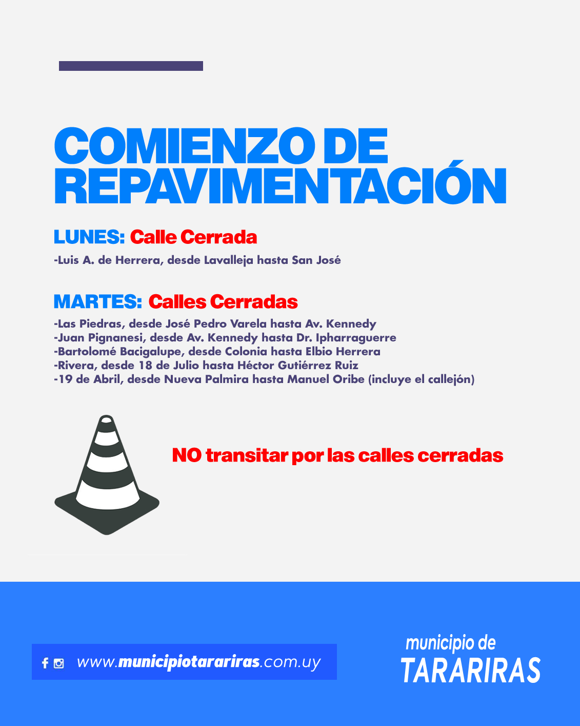 #Tarariras TARARIRAS. ATENCIÓN – COMIENZO DE REPAVIMENTACIÓN El Municipio informa que HOY LUNES la calle Luis A. de Herrera, desde Lavalleja hasta San José, permanecerá cerrada por Periodico Tarariras / 3 meses (56)
