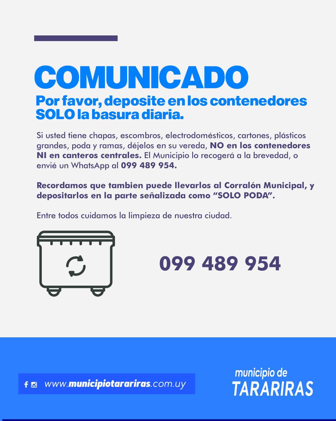 #Tarariras Comunicado del Municipio de Tarariras Por favor, deposite en los contenedores SOLO la basura diaria. Si usted tiene chapas, escombros, electrodomésticos, cartones, plásticos grandes, poda Periodico Tarariras / 4 meses (70)